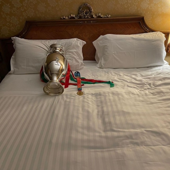 키엘리니는 12일(한국시간) 자신의 인스타그램에 "위대한 마에스트로 파비아 칸나바로의 전통에 따라서"라는 글과 함께 사진을 게재했다. 유로2020 우승 트로피를 침대 머리맡에 둔 사진이었다.