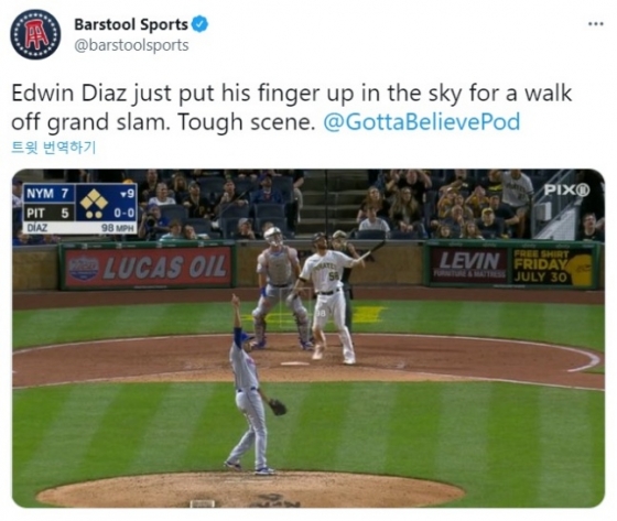 그중 백미는 9회 말이었다. 메츠는 8회 말 5점을 내줬으나 9회 브랜든 니모의 홈런으로 7-5로 2점 차 여유를 가진 상황에서 마무리 디아즈를 올렸다.