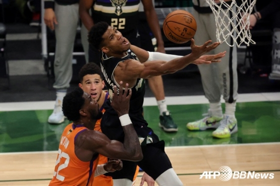야니스 아데토쿤보가 21일(한국시간) 공을 따내고 있다./AFPBBNews=뉴스1