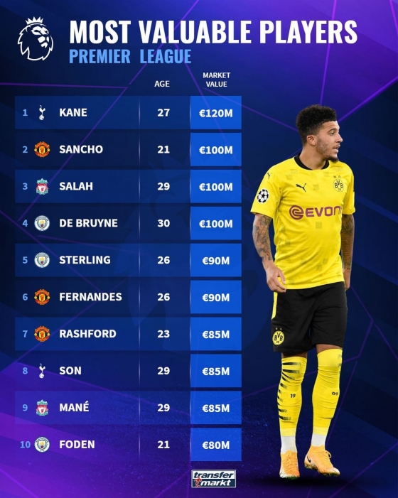 1위는 손흥민의 동료 해리 케인이 차지했다. 케인은 1억 2,000만 유로(약 1,626억 원)를 기록했다. 이번 여름 맨체스터 유나이티드로 이적한 제이든 산초는 1억 유로(약 1,355억 원)로 뒤를 이었다.