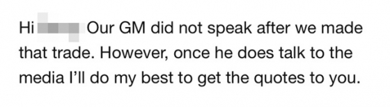 "단장이 이번 트레이드 후 아직 한 말이 없다. 하지만 단장이 언론에 언급을 한다면 최선을 다해 알려주겠다."