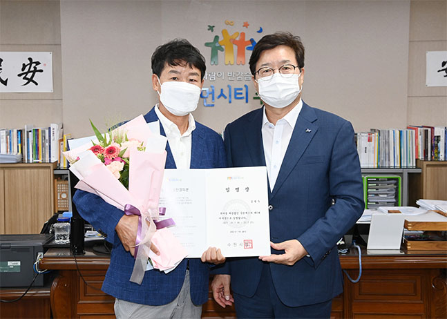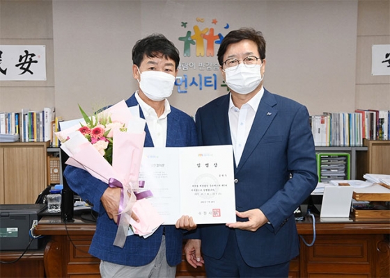 염태영 수원시장(수원FC 구단주)은 28일 집무실에서 김병두 신임 이사장에게 임명장을 수여했다. 더불어 명문 구단으로 도약 및 발전을 위해 투철한 사명감으로 헌신한 김춘호 전임 이사장에게도 공로패를 수여했다.