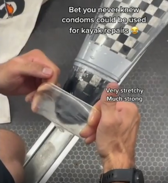 폭스는 카약의 손상된 뱃머리를 콘돔으로 감쌌다. 폭스는 "콘돔은 부드럽고 강해 물에서도 잘 견딘다"고 설명했다. 폭스는 "콘돔이 카약 수리에 사용된다는 사실을 아무도 몰랐을 것"이라 자막도 달았다.