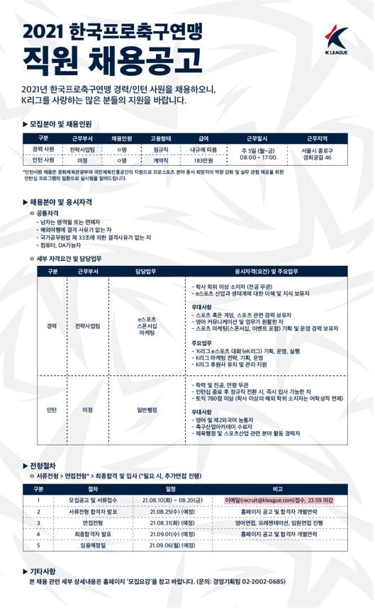 서류접수 기간은 경력, 인턴사원 모두 8월 20일(금) 자정까지이며, 이메일(recruit@kleague.com) 또는 취업포털사이트(사람인, 인크루트, 잡코리아)를 통해 지원할 수 있다. 서류전형을 거쳐 영어인터뷰, 프레젠테이션, 면접전형 순으로 진행되며 자세한 공고 내용은 프로축구연맹 홈페이지(www.kleague.com)에서 확인하면 된다.
