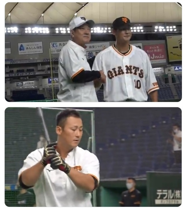기자회견 후 도쿄돔으로 이동, 요미우리 자이언츠 팀 훈련에 합류한 나카타 쇼.(아래) 하라 다쓰노리 감독(위 왼쪽)도 만났다. /사진=요미우리 자이언츠 트위터 영상 캡처
