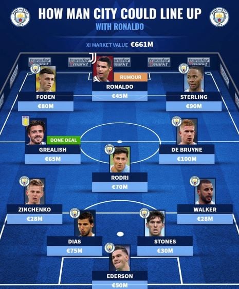 이런 상황에서 이적 전문 사이트 ‘트랜스퍼마르크트’는 맨시티가 꾸릴 수 있는 라인업을 공개했다. 호날두가 포함된 베스트11이다.