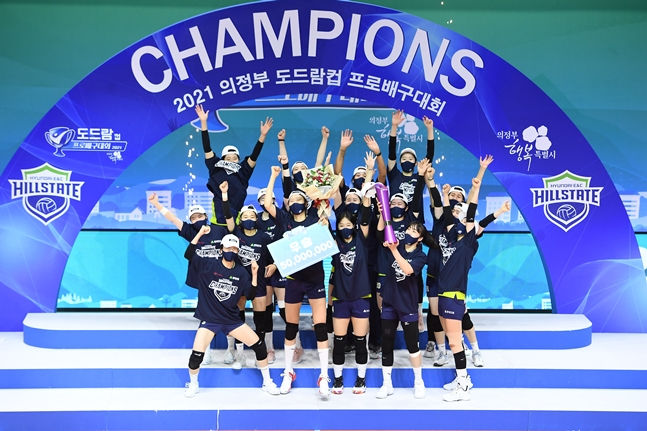 현대건설은 29일 의정부체육관에서 열린 2021 의정부·도드람컵 프로배구대회 여자부 결승에서 GS칼텍스를 3-0으로 제압하고 정상에 올랐다.최우수선수(MVP)로 꼽힌 정지윤이 17득점으로 맹활약했고 양효진(12점), 황민경(11점) 등이 힘을 보탰다. 이다현(7점)은 라이징스타상을 수상했다.