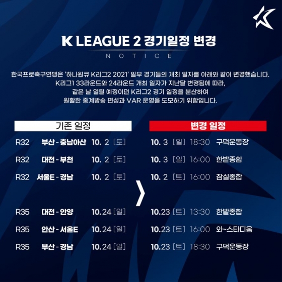 K리그1 33라운드와 24라운드 개최 일자가 지난달 변경됨에 따라, 같은 날 열릴 예정이던 K리그2 경기 일정을 분산하여 원활한 중계방송 편성과 VAR 운영을 도모하기 위함이다.