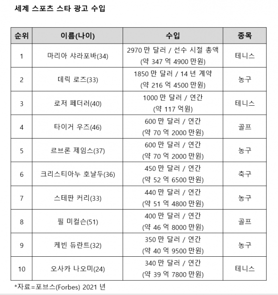 세계 스포츠 스타 광고 수입. /자료=포브스