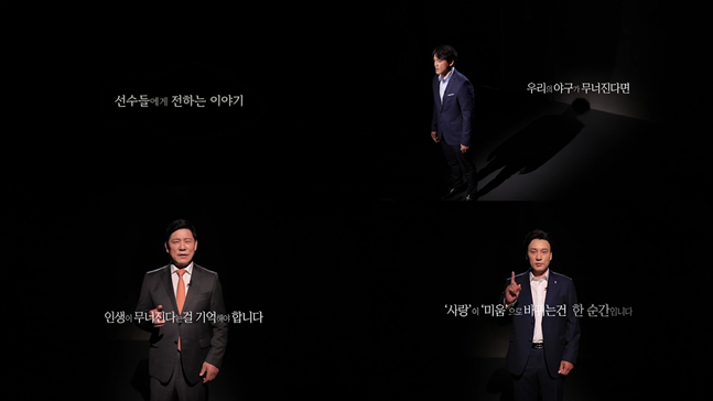 먼저 KBO는 최근 프로야구의 위기 상황을 극복해 나가기 위해 프로야구 레전드 선수들과 야구계 인사가 선수들에게 전하는 충고의 메시지가 담긴 총 3편의 캠페인 영상을 제작했다.