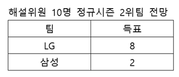 반면 삼성의 2위를 점친 전문가도 있었다. E 위원은 "박해민 부상 변수가 있긴 하지만 그래도 전력이 괜찮다. 몽고메리 징계는 큰 영향을 줄 것 같지 않다. 올 시즌 (몽고메리의) 성적을 보라. 딱 1승(2패)만 거뒀다. 그동안 잘 던진 경기가 몇 번이나 있었나. 잘 던졌던 외국인 투수라면 큰 변수가 됐을 텐데, 못 던지고 있던 투수다. 변수라 볼 수 없다"는 견해를 밝혔다.
