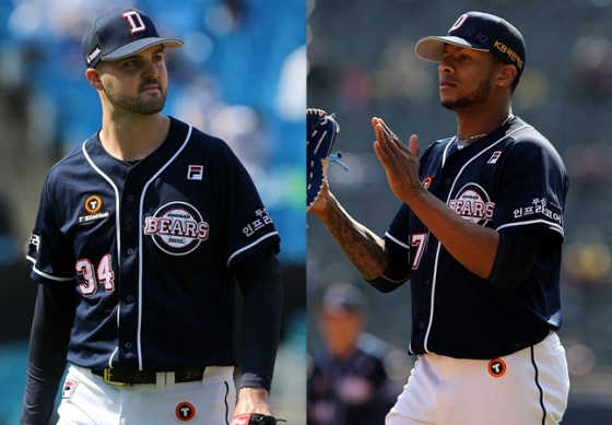 두산 베어스 외국인 원투펀치 워커 로켓(왼쪽)과 아리엘 미란다. /사진=두산 베어스 제공