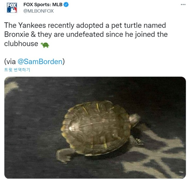 미국 매체 FOX 스포츠 MLB는 30일(한국시간) "양키스가 최근 브롱시라 이름 붙여진 애완 거북이를 입양했다. 그리고 브롱시가 클럽하우스에 합류한 이후 양키스는 지지 않았다"고 소개했다.