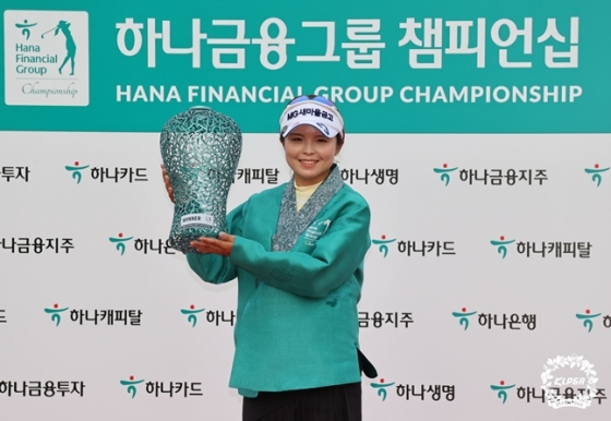 송가은이 3일 KLPGA 투어 하나금융그룹 챔피언십 우승트로피를 들고 포즈를 취하고 있다./사진=KLPGA