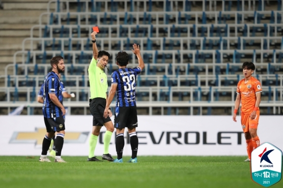 전반 36분 변수가 발생했다. 강원의 역습 상황에서 김채운이 김대원의 드리블 돌파를 막는 과정에서 반칙을 했고, 심판은 즉각 레드카드를 꺼냈다. 수적 열세에 놓인 인천은 4분 뒤 구본철을 빼고 강윤구를 집어넣었다.
