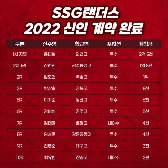앞서 지난 8월 26일에는 구단 최초 사이드암 투수 1차 지명자인 인천고 윤태현과 계약금 2억 5천만원에 입단 계약을 체결했다. SSG는 "수준급의 구위와 안정된 제구능력을 보유한 윤태현은 프로지명 후 2021 WBSC U-23 야구월드컵 국가대표팀 선수로도 발탁되어 활약했다"고 말했다.