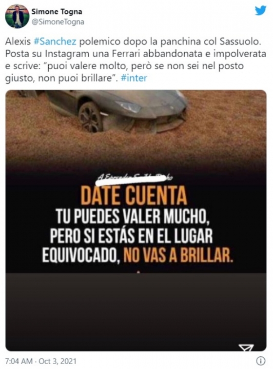 이에 산체스는 지난 3일 자신의 SNS를 통해 버려진 슈퍼카 페라리가 모래로 뒤덮인 사진과 함께 “당신은 많은 가치를 가질 수 있지만, 잘못된 선택을 하면 빛날 수 없다”는 글을 남겼다. 감독인 시모네 인자기를 저격했다. 이를 풋볼이탈리아 등 다수 언론이 전했다. 글은 삭제됐지만, 이미 돌이킬 수 없는 상황이 됐다.