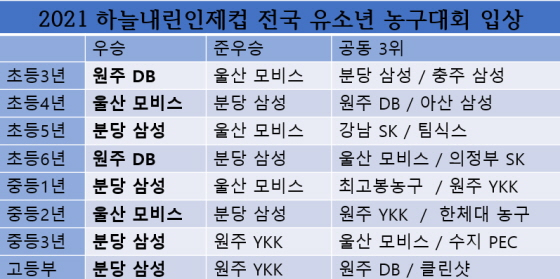 초등학교 3학년부터 고등부까지 총 8개 종별에 걸쳐 펼쳐진 2021 하늘내린인제컵 전국 유소년 농구대회에선 분당 삼성, 충주 삼성 등 가장 많은 팀을 내보낸 삼성 유소년 농구교실이 가장 많은 4개 종별의 우승을 차지했다.