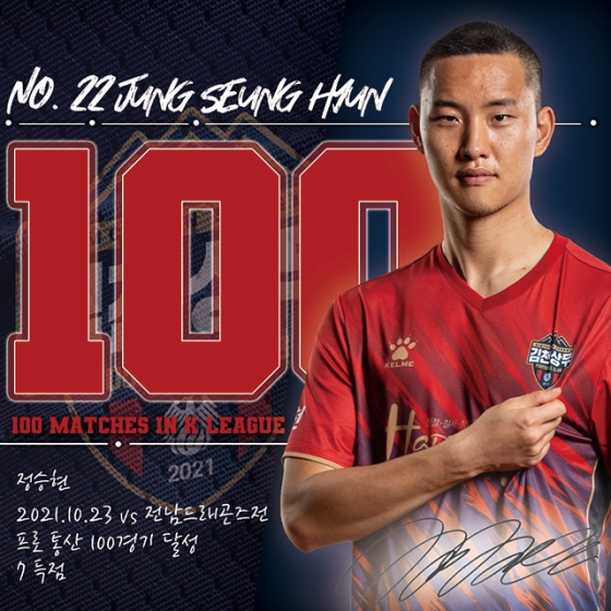 김천은 지난 23일 김천종합운동장에서 열린 하나원큐 K리그2 2021 35라운드 전남 드래곤즈와 홈경기에서 3-1로 역전승을 거뒀다. 이날 주장으로 선발 출전한 정승현은 팀의 두 번째 득점을 성공시키며 역전승에 기여했다. 특히 정승현은 이날 개인 프로통산 100경기를 달성하는 영광을 누렸다.