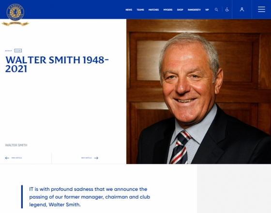 영국 언론 BBC와 레인저스FC(스코틀랜드) 공식 홈페이지 등은 현지 시간으로 26일 월터 스미스가 사망했다고 밝혔다.