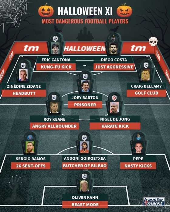 유럽 축구 통계 매체 ‘트랜스퍼마크트’는 1일(한국시간) 할로윈 베스트 11을 자체 선정해 보도했다. 기준은 논란의 중심에 선 선수들로 꾸려졌다.