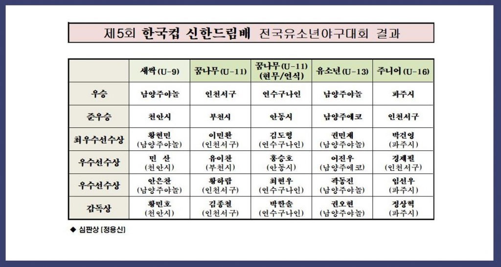 5할이 넘는 타율과 준결승부터 결승전까지 선발승을 올린 권민재(남양주야놀유소년야구단·해밀초6)가 대회 최우수선수(MVP)상, 유격수로서 매 경기 팀 승리에 기여한 곽동진(남양주야놀유소년야구단·원묵초6)과 팀을 준우승으로 이끈 포수 어진우(남양주에코유소년야구단·태릉초6)가 우수선수상을 받았다.