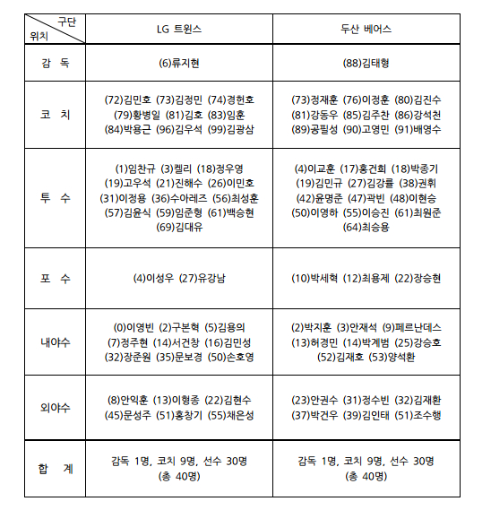 KBO는 3일 2021신한은행 SOL KBO 준플레이오프 출장자 명단을 확정해 발표했다. 양 팀 모두 감독 1명, 코치 9명, 선수 30명으로 총 40명이다. 4일 오후 6시 30분 잠실구장에서 준플레이오프 1차전이 치러진다. 두산은 최원준을, LG는 앤드류 수아레즈를 선발로 낸다.