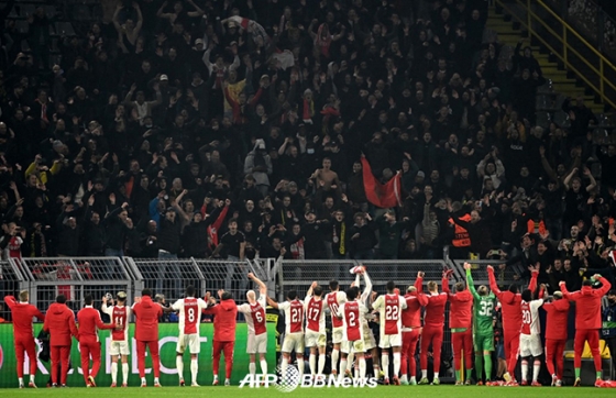 도르트문트 원정에서 3-1로 승리한 뒤 원정팬들과 인사를 나누고 있는 아약스 선수들. /AFPBBNews=뉴스1