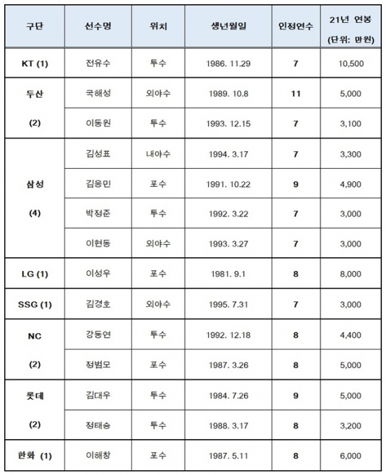 대상 선수는 삼성이 4명으로 가장 많고 두산, NC, 롯데가 2명, KT, LG, SSG, 한화가 각 1명씩이다. 키움과 KIA는 대상 선수가 없다.