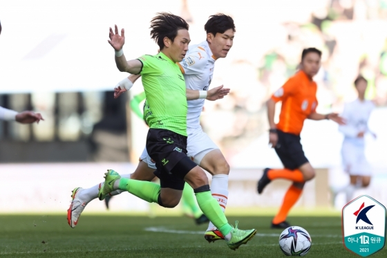 전북은 천천히 공간을 점유하며 제주 진영을 침투했다. 전반 5분에는 이성윤이 페널티지역 왼쪽에서 날카로운 오른발 슈팅을 시도했다. 제주도 측면을 적극적으로 활용하며 전북 뒷공간을 노렸다.