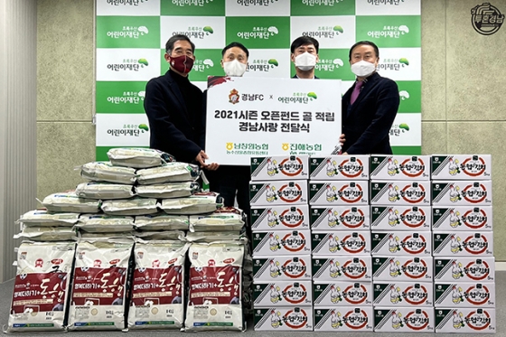 경남이 '하나원큐 K리그2 2021'에서 40골을 넣음에 따라 남창원농협과 진해농협은 각각 가마솥구수미 10kg 40포대, 농협김치 5kg 40박스를 초록우산 어린이재단에 전달했다.