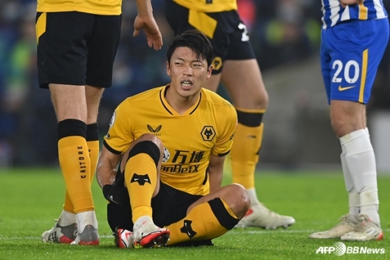 울버햄튼 황희찬이 16일 브라이트전에서 햄스트링 부상을 당한 후 고통스러워하고 있다. /AFPBBNews=뉴스1