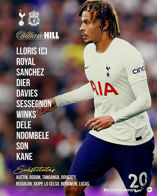 벤치에는 루카스 모우라와 스티븐 베르바인, 지오바니 로 셀소, 올리버 스킵, 세르히오 레길론, 맷 도허티, 야펫 탕강가, 조 로든, 브랜던 오스틴(GK)이 앉는다.
