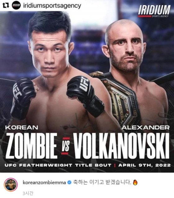 이후 볼카노프스키가 SNS를 통해 정찬성에게 직접 메시지를 전했다. "코리안 좀비. 나와 맞붙자"는 볼카노프스키의 도발에 정찬성은 "물론"이라며 응했다.