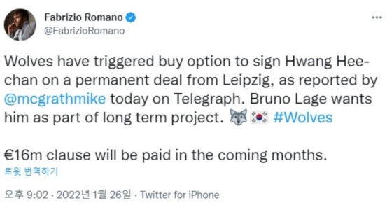 '토크스포츠'의 알렉스 크룩 기자는 "울버햄프턴이 오는 7월 1일 황희찬 완전 영입 발표를 준비 중이다"라고 언급했고 유럽 이적시장에 정통한 파브리지오 로마노 기자도 "라즈 감독은 황희찬을 장기 프로젝트의 핵심으로 보고 있다. 울버햄프턴은 완전 영입 옵션을 발동, 이적료는 1,600만 유로(약 216억원)다"라고 밝혔다.