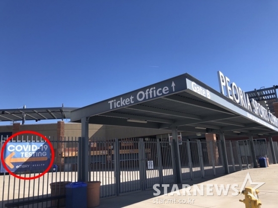 샌디에이고 구단이 스프링캠프 홈구장으로 사용하는 피오리아 스포츠콤플렉스 한쪽 벽면에는 '코로나19 검사소'를 알리는 현수막이 걸려 있었다. 화살표를 따라간 샌디에이고 구단 스프링캠프 앞 주차장에는 코로나19 검사를 받으러 온 사람들이 타고 온 차량들만 긴 줄을 이루고 있었다.