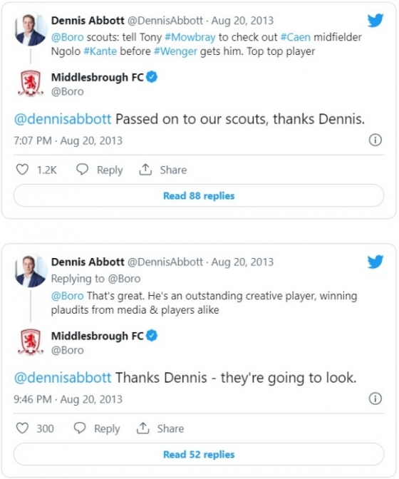 애보트는 미들즈브러 공식 SNS 계정에 "스카우트들은 벵거가 데려가기 전에 토니 모브레이(당시 미들즈브러 감독)에게 캉의 미드필더 캉테를 확인하라고 전해달라. (그는) 톱 톱 플레이어"라고 추천하면서 "캉테는 미디어와 선수 모두로부터 찬사를 받는 뛰어나고 창의적인 선수"라고 재차 말을 남겼다.