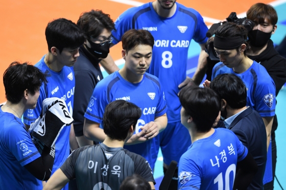 하승우(가운데)가 신영철(오른쪽 양복 입은 이) 감독의 지시를 듣고 있다./사진=KOVO