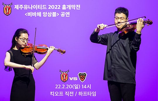 2022시즌 홈 개막전 상대는 포항 스틸러스. 오는 2월 20일(일) 오후 2시 제주월드컵경기장에서 열린다. 이날 제주는 선수들이 승리의 하모니 뿐만 아니라 또 다른 울림 있는 하모니를 준비했다. 제5회 전국 발달장애인 음악축제(Great Music Festival)에서 대상(문체부장관賞)을 수상한 ‘비바체 앙상블 (바이올린/비올라 듀오)’을 초청한다. ‘전국 발달장애인 음악축제’는 장애인과 비장애인 구분 없이 아름다운 선율로 모두가 행복한 사회를 만들기 위해 SK이노베이션이 올해로 6년째 후원하고 있는 전국 최대 규모의 발달장애인 음악 경연 축제이다.
