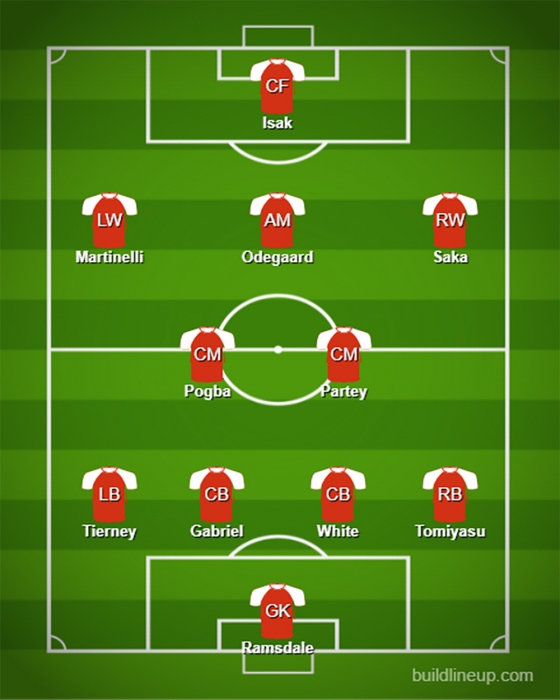 2선의 경우 왼쪽에 가브리엘 마르티넬리, 중앙에 마르틴 외데고르, 오른쪽에 부카요 사카가 차례로 이름을 올렸다. 중원에는 포그바와 토마스 파티가 위치했다. 포백라인은 키어런 티어니, 가브리엘 마갈량이스, 벤 화이트, 토미야스 타케히로가 구축했고, 골키퍼 장갑은 램스 데일이 꼈다.