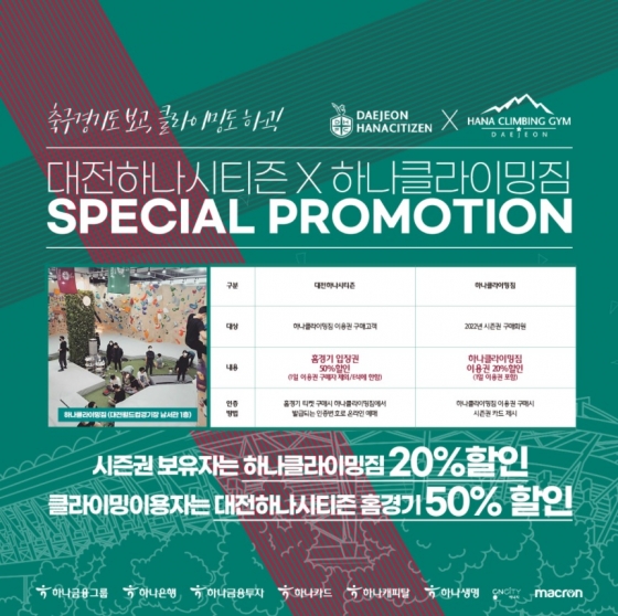 하나클라이밍짐 회원은 대전 홈경기를 50% 할인된 가격에 관람할 수 있다. (E석에 한함).
