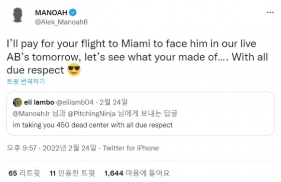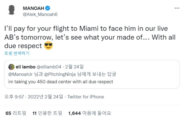 마노아는 지난 25일(한국시간) SNS상에서 한 야구팬에게 "마이애미로 오는 비행기 티켓은 내가 끊어줄 테니 내일 있을 라이브피칭에서 (우리 형이랑) 한 판 떠봐. 당신이 어떨지 한 번 보고 싶다"라고 도발했다.