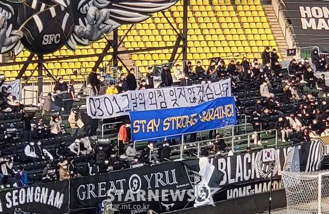 성남 서포터스는 1일 오후 4시 30분 탄천종합운동장에서 열린 성남과 서울의 하나원큐 K리그1 2022 3라운드 경기 시작 직전 '03.01 그날의 외침 잊지 않겠습니다'라는 현수막과 'STAY STRONG UKRAINE!(우크라이나 힘내라)'라는 현수막을 동시에 들어 올렸다.