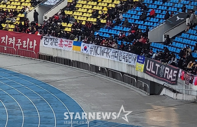 반대편 서울 서포터스석에도 '전쟁은 축구로'라는 현수막과 '#NO WAR, #대한독립만세'라는 현수막이 설치됐다. 두 현수막 사이엔 대한민국과 우크라이나 국기가 나란히 걸려 의미를 더했다.