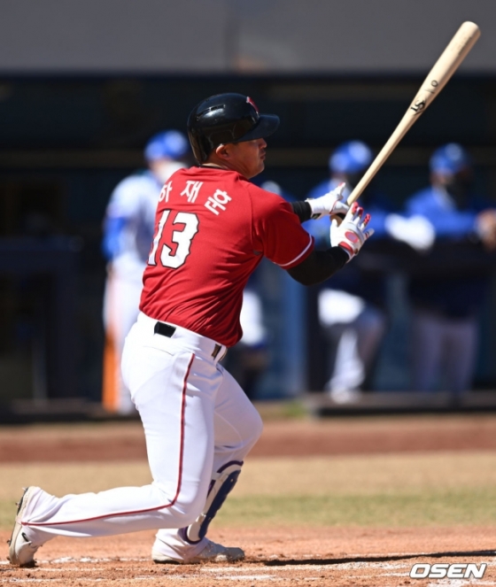 돌고 돌아 다시 방망이를 잡은 '세이브왕' 하재훈(32·SSG)이 시범경기에서 첫 안타를 신고했다.