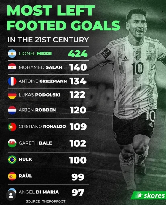 메시의 대기록과 함께 또 하나 팬들의 눈길을 끈 부분이 있다. 바로 호날두가 6위에 자리한 것. 순위에 위치한 선수들은 모두 왼발잡이 선수들이다. 하지만 호날두는 오른발이 주발이다. 그가 지금껏 기록한 득점의 90% 가까이 오른발로 넣은 골이다.