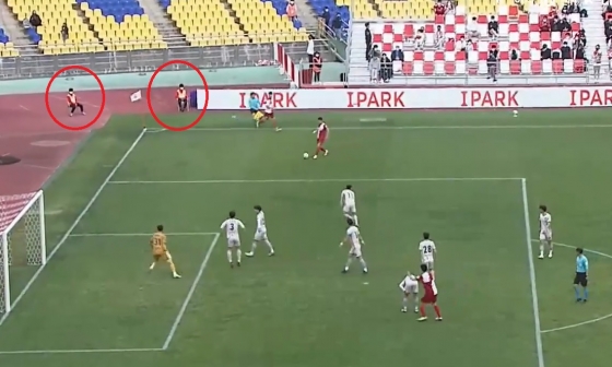 이때 최봉진이 장갑을 낀 두 손을 모으며 안도의 한숨을 내쉬었다. 그런데 당황한 최봉진이 자기 골문으로 다급히 돌아서는 모습이 포착됐다.