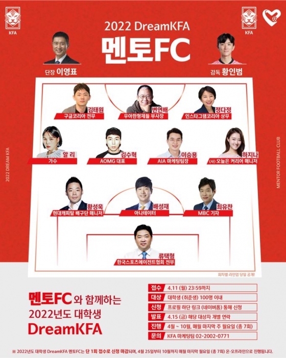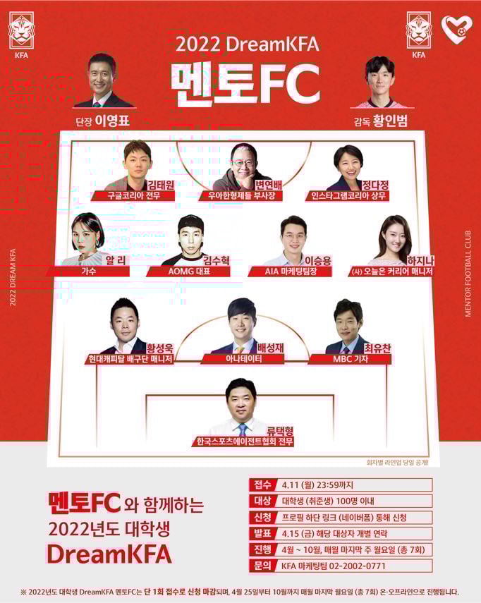 대한축구협회는 '2022년 드림(Dream)KFA 멘토FC' 프로그램에서 활동할 멘토 명단을 발표하고, 다음달 11일까지 수강생을 모집한다고 밝혔다.