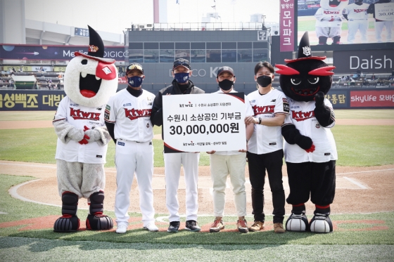 KT 위즈는 3일 수원 KT위즈파크에서 열린 삼성과 홈 경기에 앞서 이강철 감독, 선수단과 함께 소상공인을 위해 3000만원을 기부했다.