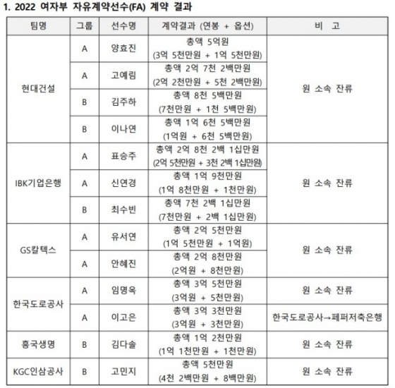 한국도로공사의 임명옥(36)은 총액 3억 5000만원(연봉 3억원+옵션 5000만원)에 잔류하면서 한송이, 정대영과 함께 여자부 최다 FA 계약 선수로 등극했다. GS칼텍스의 유서연(23), 안혜진(24), 흥국생명의 김다솔(25), KGC인삼공사의 고민지(24)도 각각 첫 FA를 체결했다.